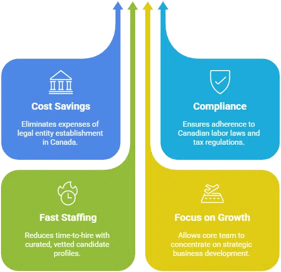 - Simplified compliance: Our EOR hires talent while strictly adhering to Canadian labor laws and tax regulations, ensuring zero risk to your business.